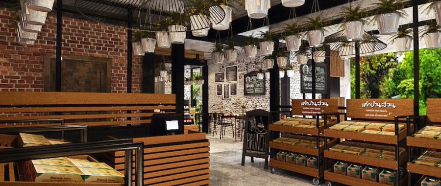 และด้านหน้าโครงการ เราเลือกออกแบบโรงแรมโดยจัดพื้นที่ส่วนหนึ่งให้เป็นร้านกาแฟเล็กๆที่ขายขนมของลูกค้าเองด้วย